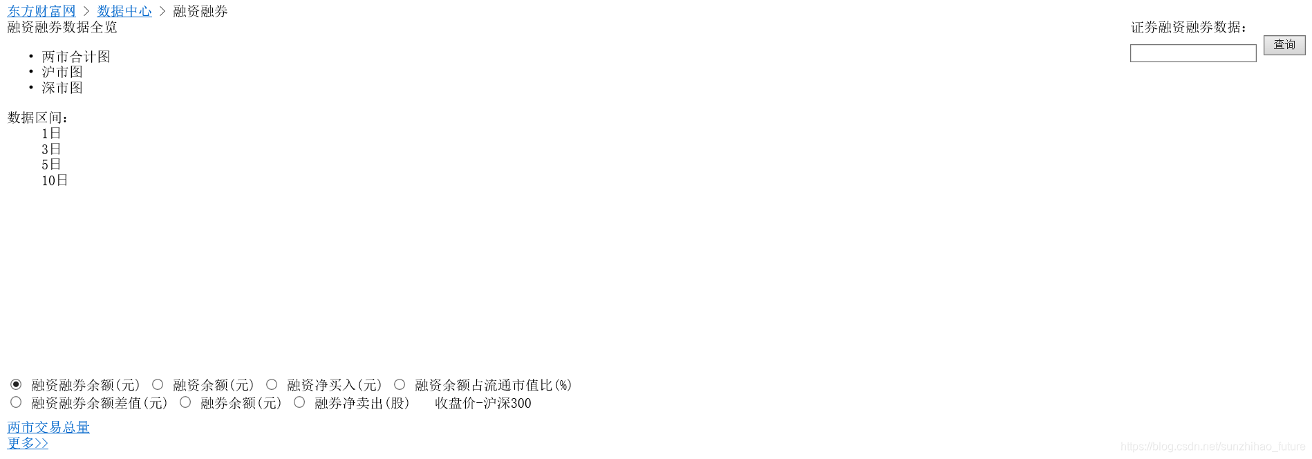 当您来到东方财富网-融资融券,您会发现我们可以在下图所示部分获取所有证券信息。点击每只证券后,您可以进一步获取该证券每日的详细融资融券信息。