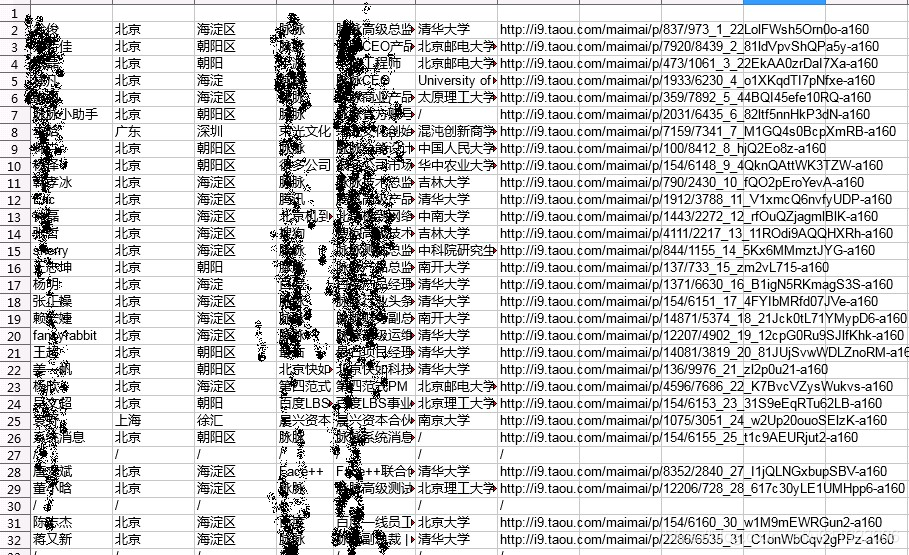 通过正则匹配,得到一个名字列表,第一条数据代表用户的名字,可以直接得到。如果某些用户 id 不存在,则返回“/”以填充该位置。本来我是想直接把这种无效信息去掉,但是我想看,比如1000个用户,有多少是无效的,所以直接填了位置。其他信息:同职位、居住地、公司等。如上图,我只取了姓名、居住地、职位、公司、头像等。
