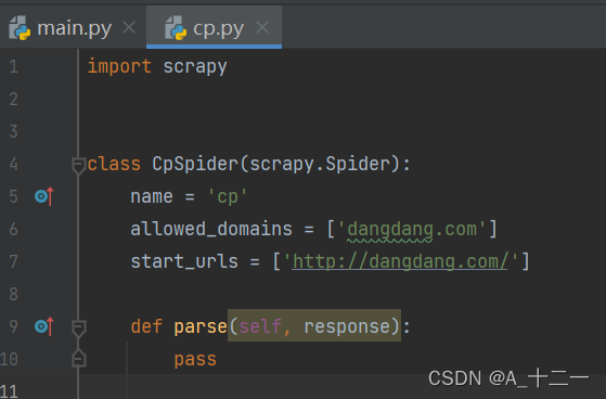 2、创建蜘蛛,输入如下代码,注意:“cp”是爬虫的名字,“”是start_url,这是必不可少的