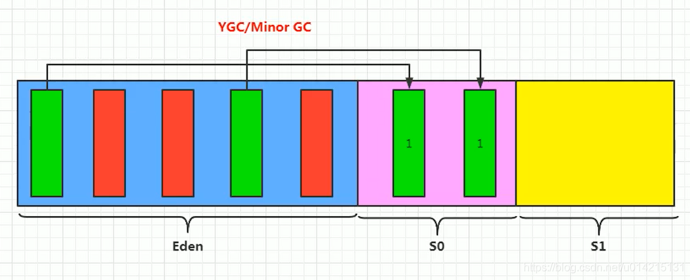 应用线程不断活跃后,年轻代空间会逐渐被填满。当JVM分配对象到Eden区失败(Eden区已满)时,会触发STW式的年轻代集合。在年轻代集合中,Eden分区中幸存的对象会被复制到Survivor分区;原Survivor分区中的存活对象将根据tenuring阈值、新的Survivor分区和旧的分区被提升到PLAB中。原来的年轻代分区会被整体回收。
