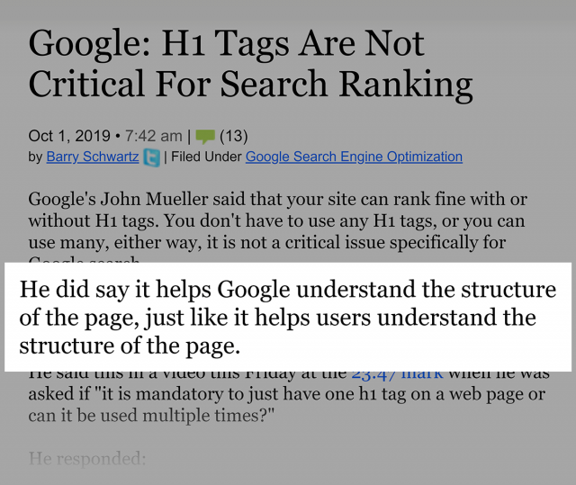 H1标签就像一个迷你标题标签。实际上,Google已经声明H1标签“有助于谷歌了解页面的结构”。