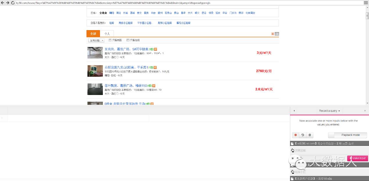 import.io的Connector就是在网页上做动作,主要是针对网址无变化,但信息在深层次页面上。需要做了动作以后才能显示出来,但是页面的网址又不发生变化,这就大大增加了采集数据的难度,因为即使配置好了规则,结果爬虫进入的页面是初始页面,无法采集到目标信息,而Connector的存在就是为了解决此类问题。Connector可以记录这一点击过程,进而采集到目标页面的信息。同样以58同城租房信息为例来测试Connector功能的可操作性。
