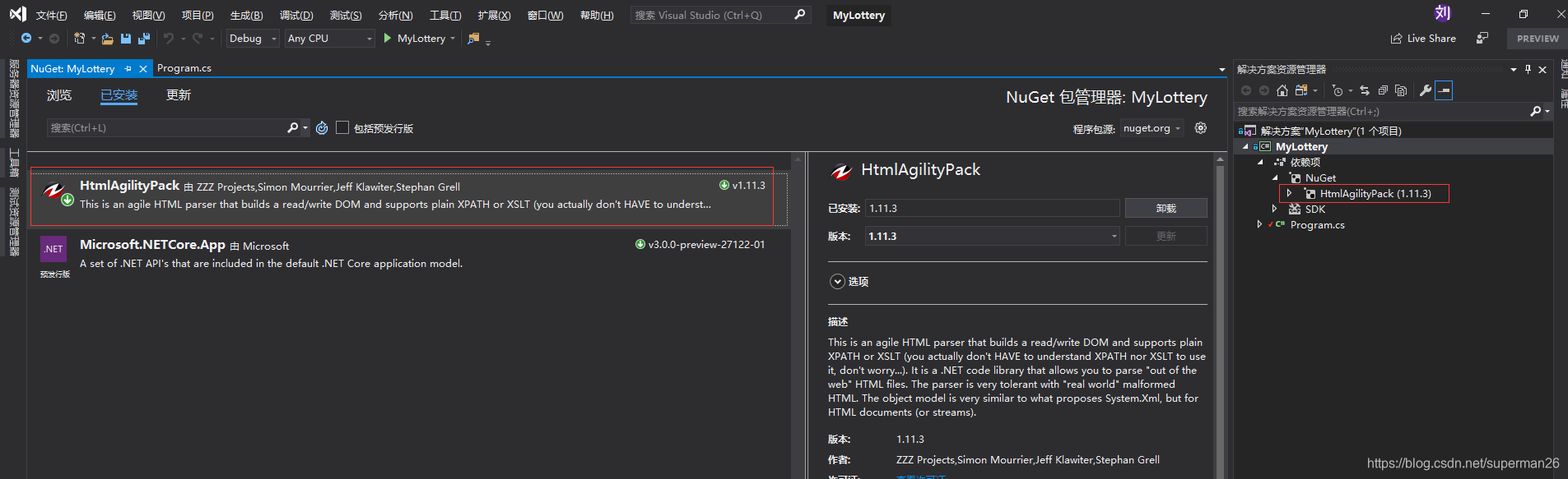 第一步是新建一个控制台程序,然后添加Nuget包HtmlAgilityPack