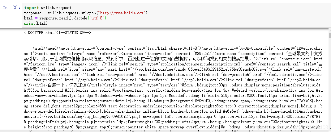 我们先用urllib2.urlopen()方法抓取百度主页,f为句柄,使用str=f.read()将所有源码读入str