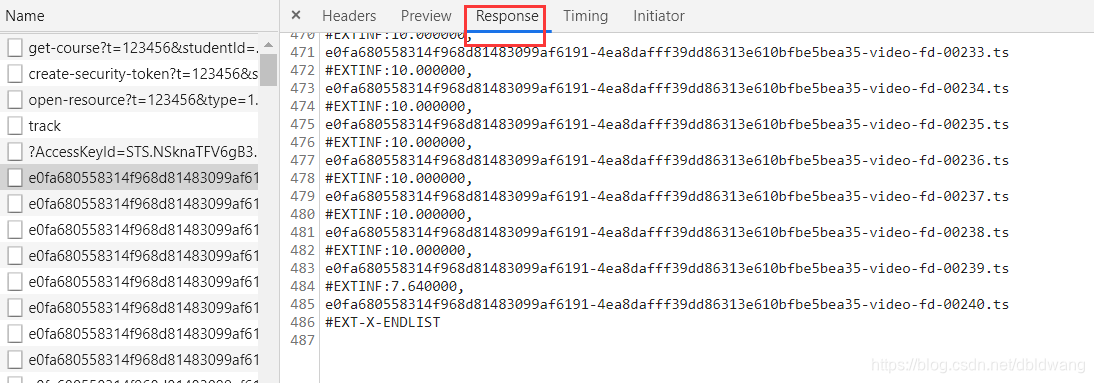 先打开开发者工具,然后搜索m3u8,会返回很多ts文件,像这种ts文件,都是视频片段