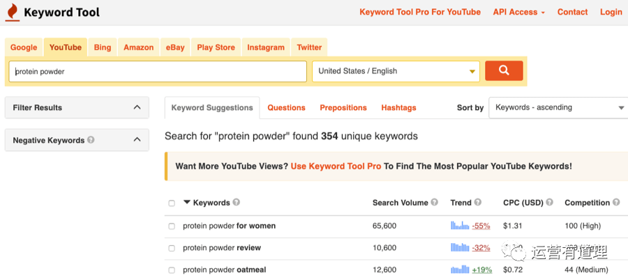 Keyword.io 和Keyword tool.io类似,但它比后者更强的,可以查看更多的平台的热门长尾关键词,比如它还可以查看Ebay, Alibaba, Fiver, Fotolia等平台。