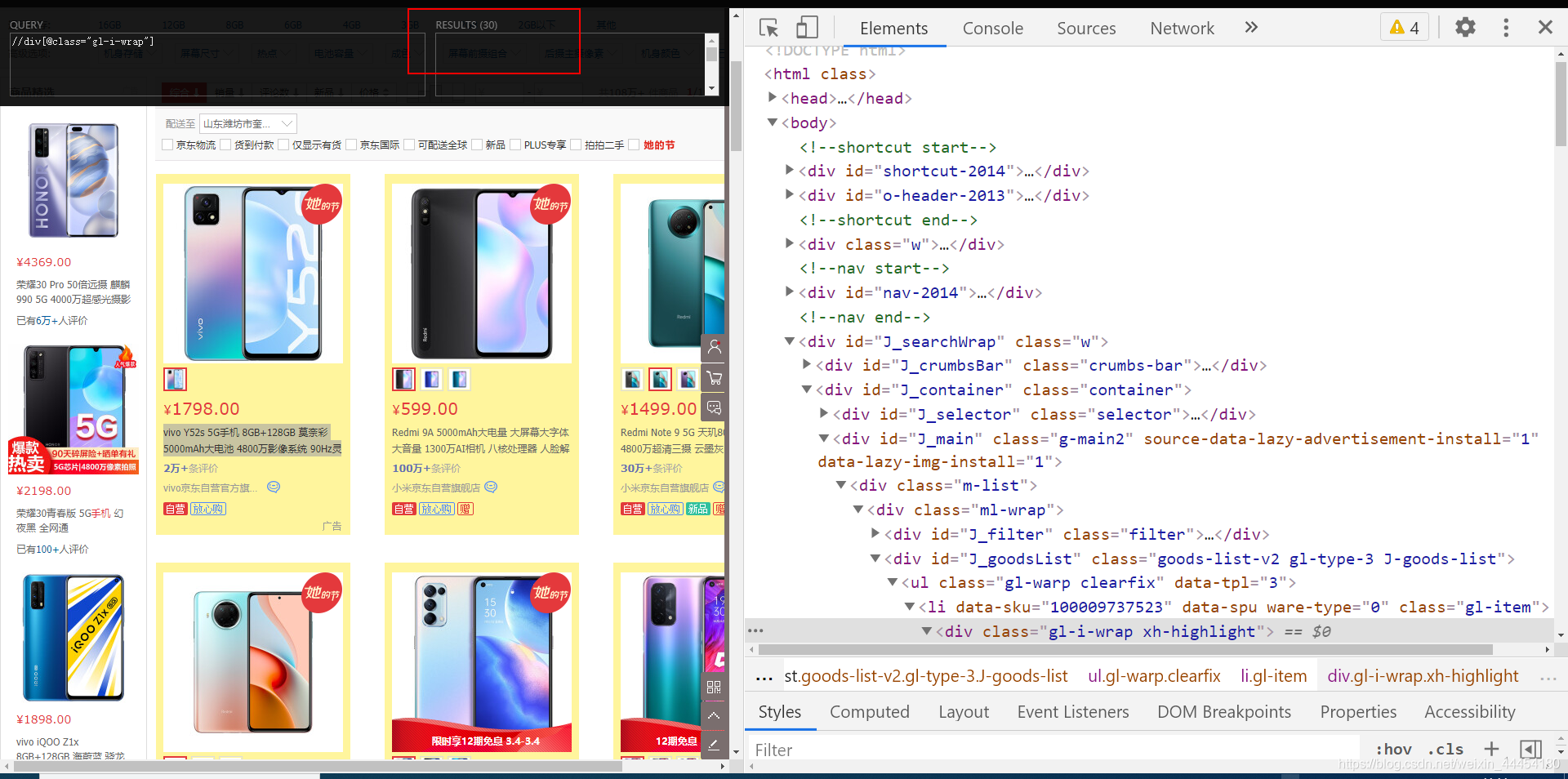 使用xpath获取并尝试一下,我们会看到30个加载并渲染,剩下的30个没有渲染。我们往下拉,会发现30变成了60,剩下的30是动态加载的