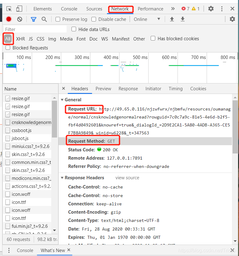 源码中的几行代码说明这个页面的数据是前端获取并渲染的,所以我们需要从网页响应中找到对应的接口。